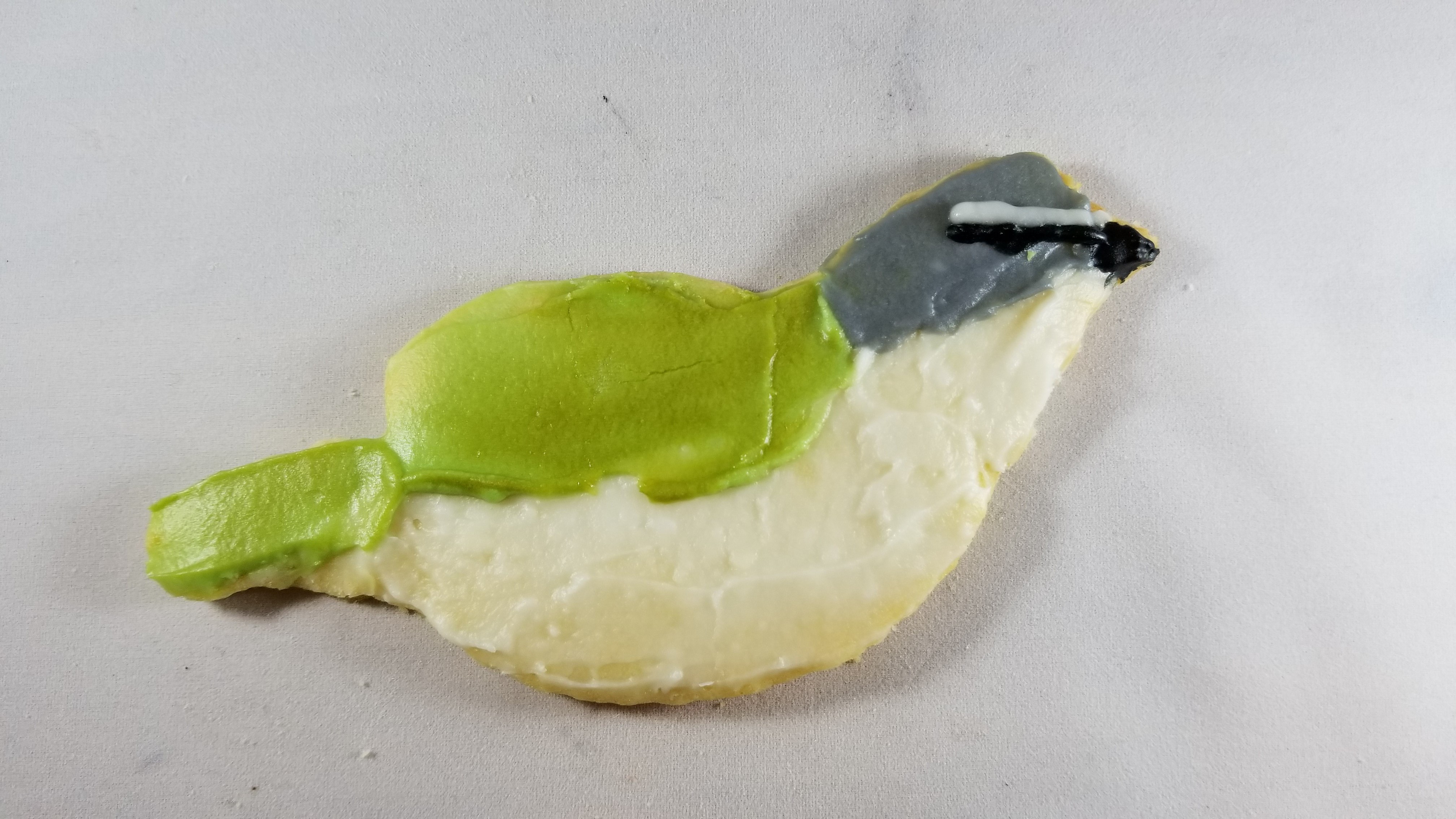 Light front. Green back. Blue/gray head with white eyebrow.