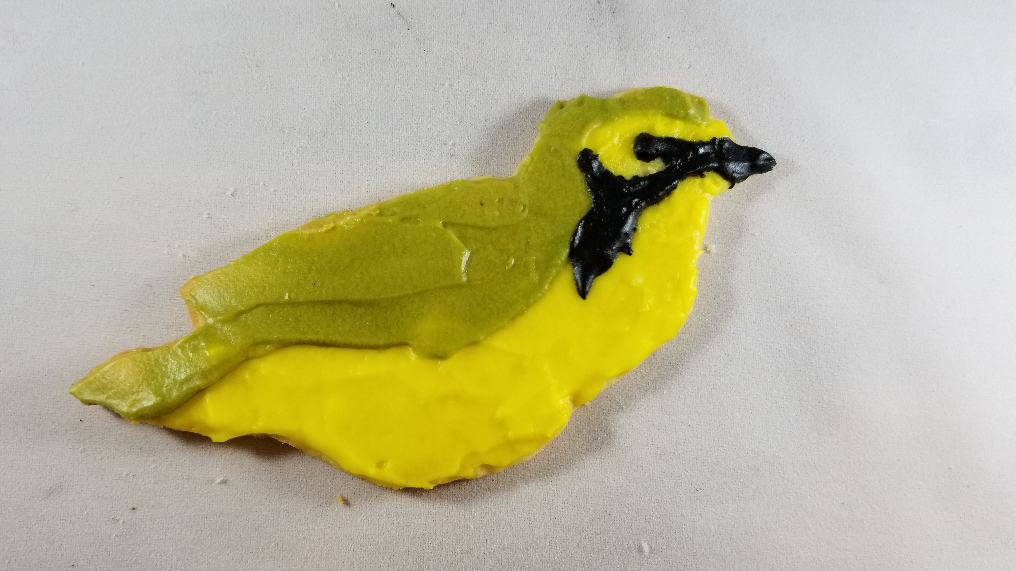 Yellow front, olive back. Black cap and mask, with yellow eyebrow and spectacles.