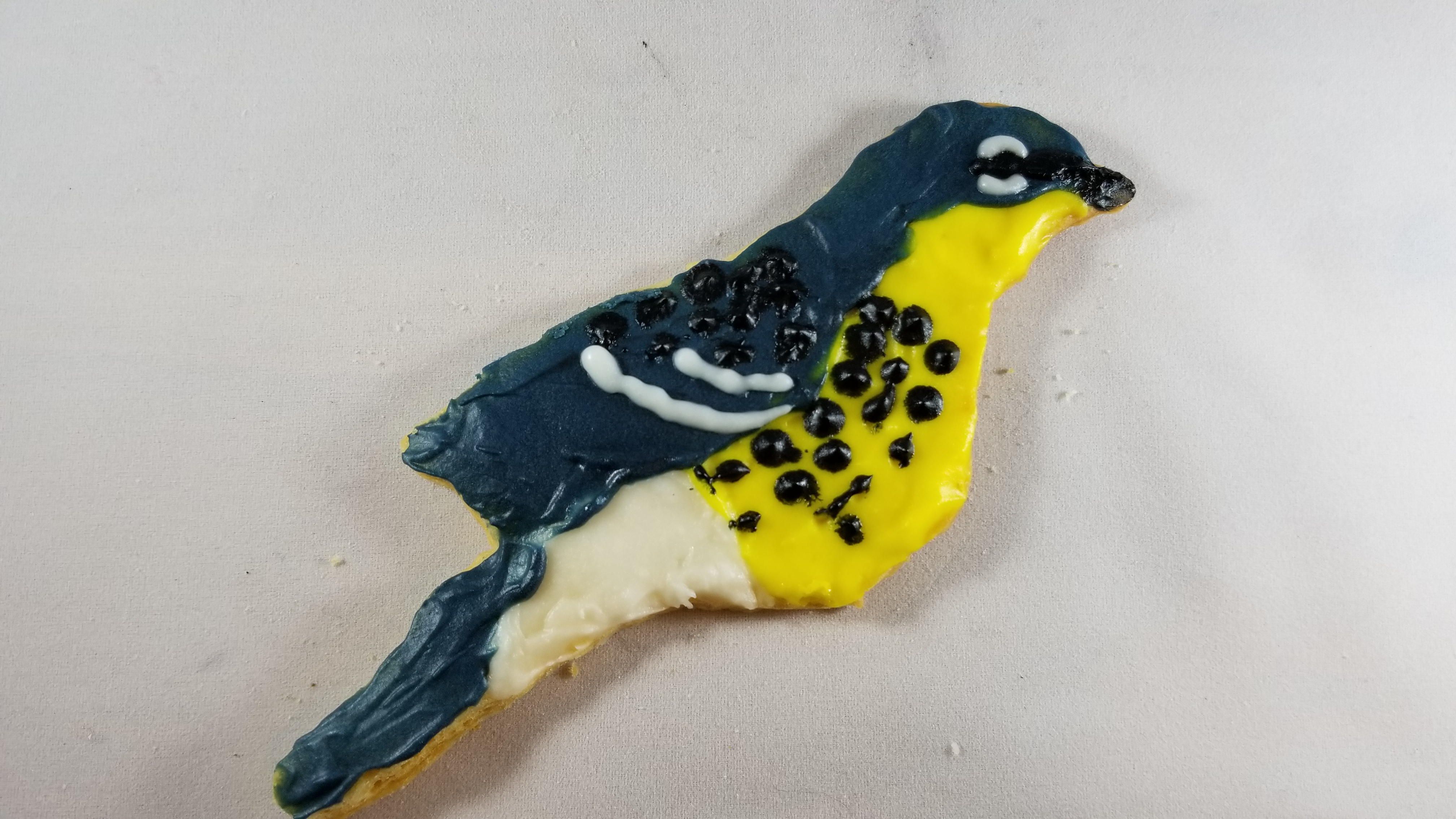 Yellow front/throat and blue back/head. Broken white eye ring and two white/gray wing bars. Black spotting on sides and back.